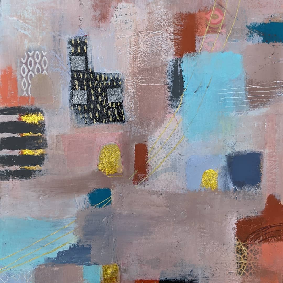 We used gorgeous collage papers as the first layer and colorways and mark making on top based on the colors and patterns of Marrakech, Morocco.