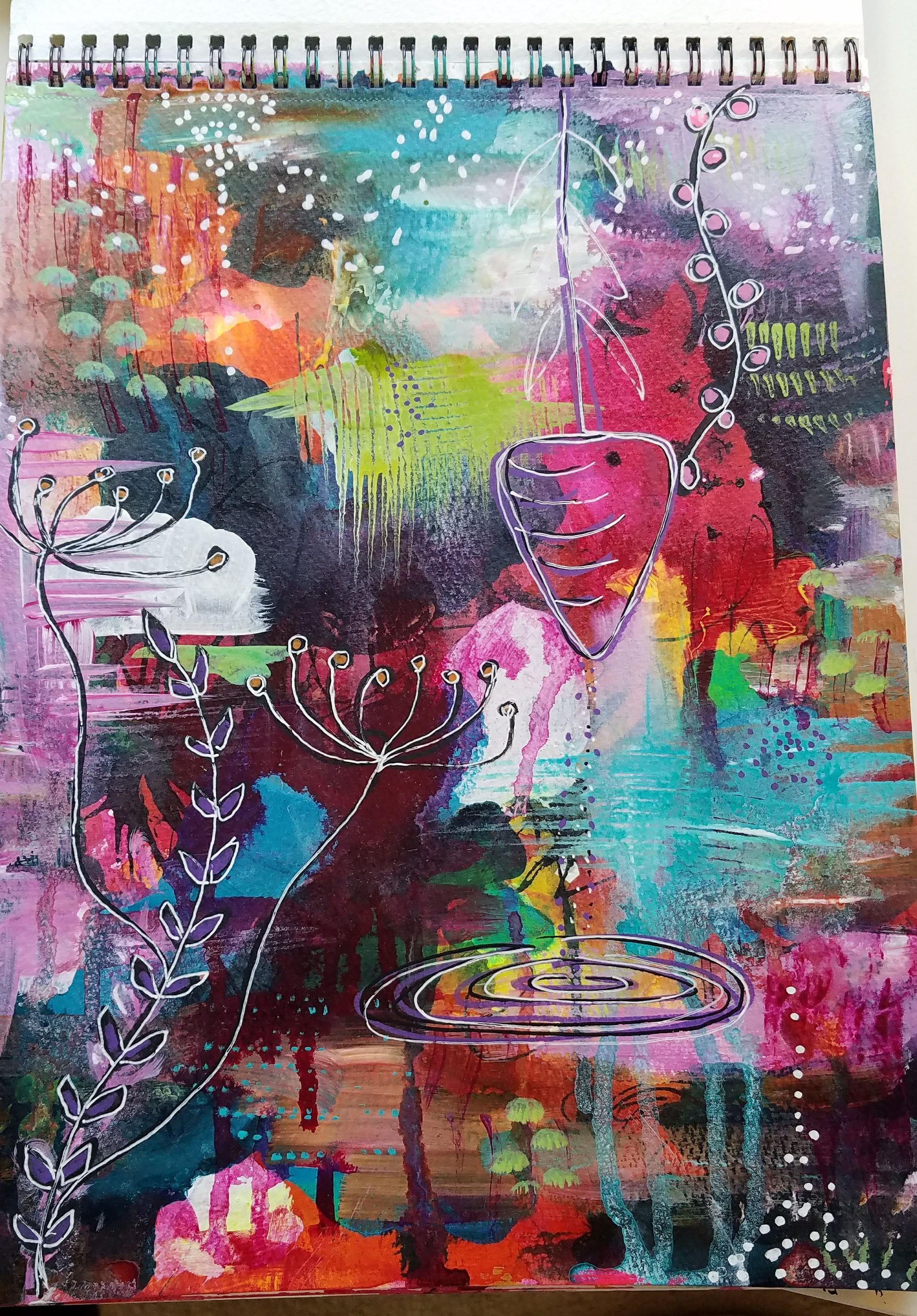Interesting experiment. I don’t love it but learning to be fearless and to be willing to let go is one of the reasons I paint this way. The beauty of these paints and drawing media is that I can continue to paint and cover up what I don’t like and keep what is starting to ring true for me. It’s a continuous process of learning what I like and what I respond to and of trusting my intuition.