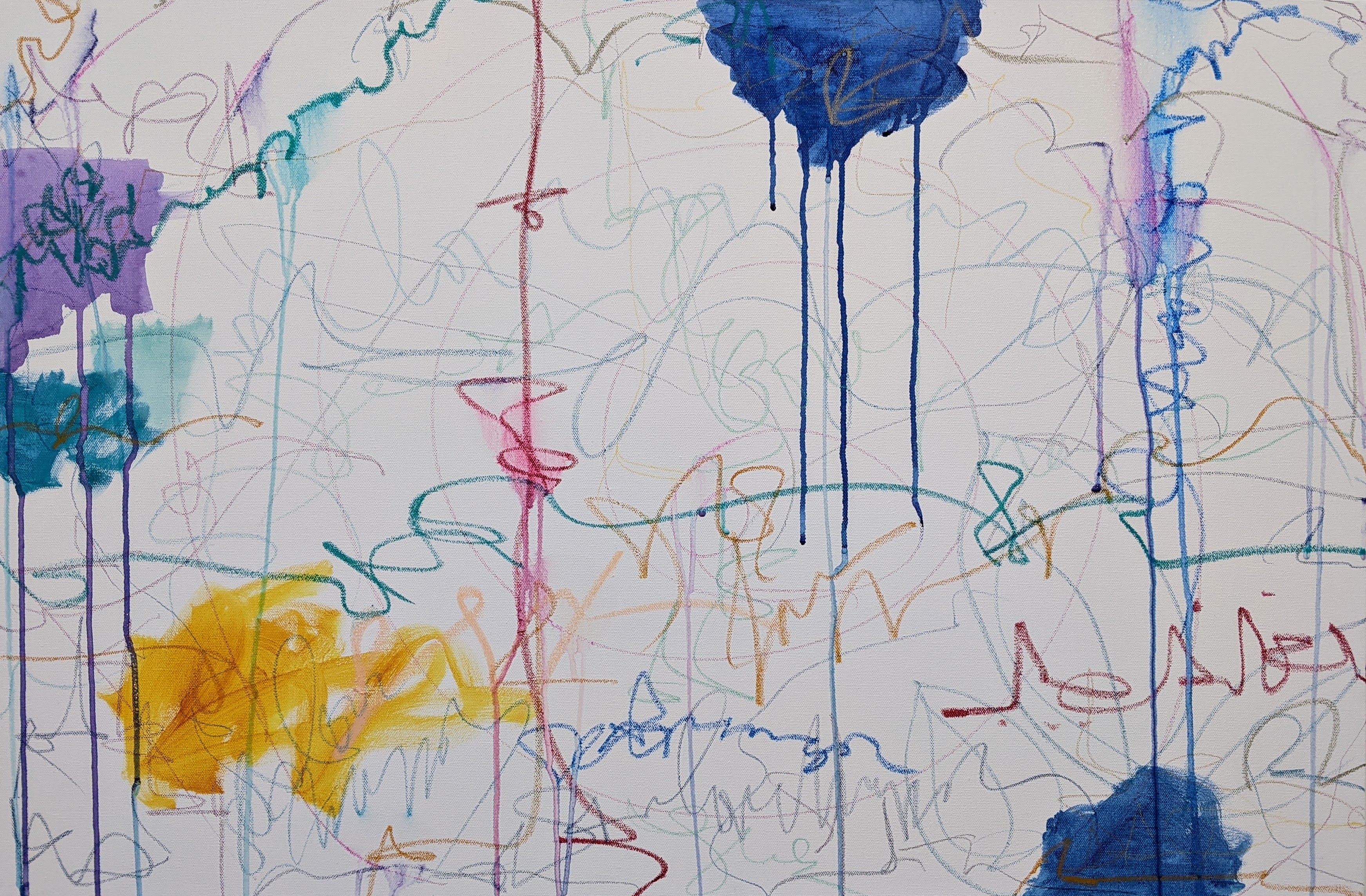 After that layer dries, I start adding paint with brushes, sponges, and my hands. I love the sensory nature of painting with my hands. I turn the painting 90 degrees and add drips that will run across the painting in it’s final orientation. I end this painting session with more mark making, lines and scribbles, into the wet paint so that prior layers peek through.