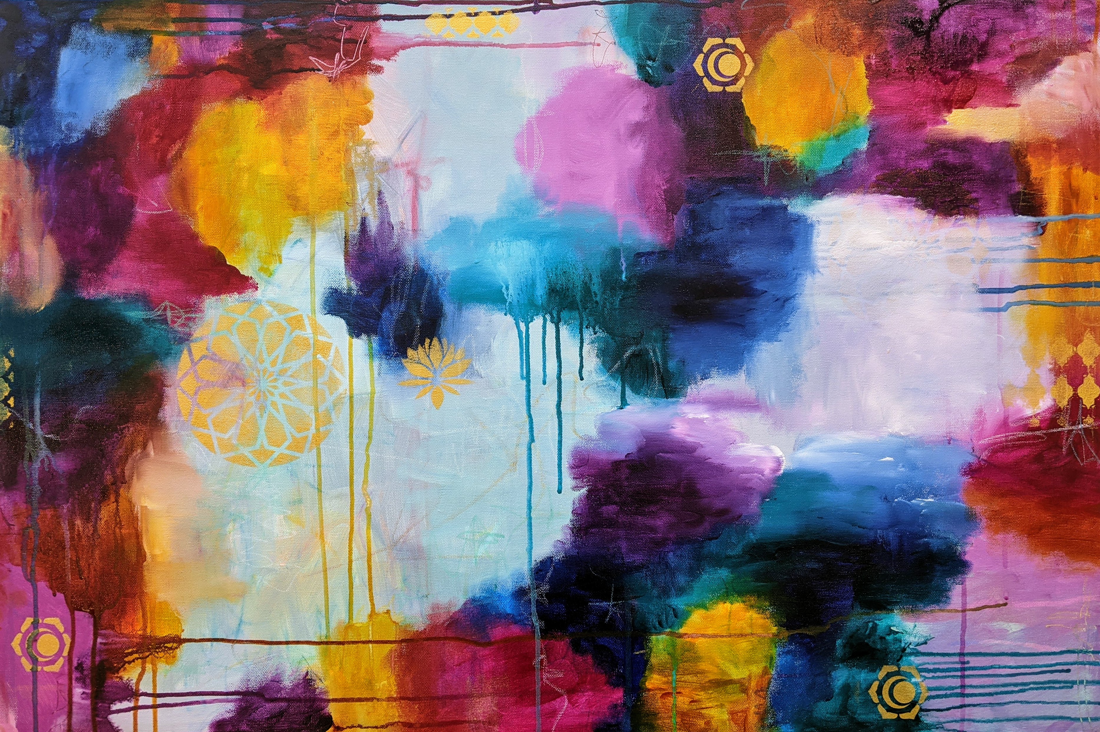 In this layer, I’ve added more paint and layered more drips. I also added stencils of a middle eastern geometric design, the sacral chakra, and a lotus with gold paint. I know that I’m not done yet, but I’m making progressively smaller changes and stepping back from the canvas more and more to look at it from different angles and depths. I like the addition of the stencils but I don’t want them to pop too much, so I’ll partially hide some of them behind paint and may cover some of them completely. More layers add more mystery and interest to the painting and I find that the layers invite viewers to look at the piece closer and spend more time with it.