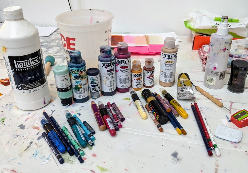 I then choose my mark making tools, pastels, pencils, pens, chalk, etc. in the same colors as my palette. Even though I won’t necessarily use all of these, I like having options…